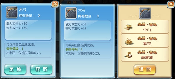 了解完武将这些宝物的逆天属性后,这些趁手的宝物又要从何处获得呢?如果当前武将已经拥有可以装备的宝物时,就可以点击“装备”来穿戴这件宝物,如果没有可以装备的宝物时,可以通过“获取”功能来得之宝物的获取途径,进而获得宝物。