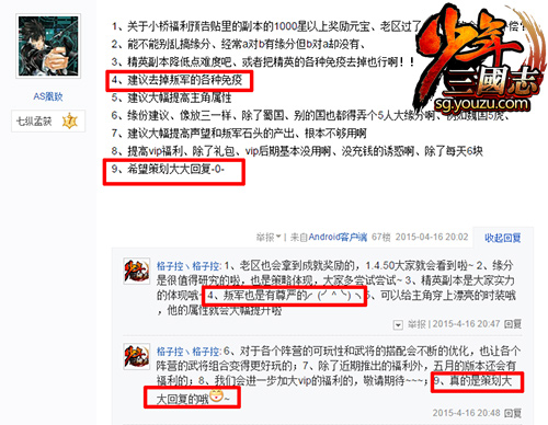 此次玩家策划面对面是《少年三国志》公测之后首次进行,而且本月还有最新的资料片,少年们一早就开始准备问题,甚至有玩家提前写好了千字以上的建议,策划大大感动之余也表示压力山大!少年们提出的问题可以说360度无死角覆盖了游戏的各个角落,大到阵容的搭配、副本的难度、领地攻讨的碎片掉落,小到精力丹的领取、某个武将的缘分、策划在不在等问题,而且情绪高涨,帖子一经开出就已经有十几页的跟帖,气势恢弘!