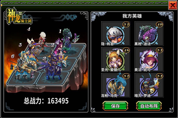 排兵布阵永远是《神龙骑士团》中最重要的课题。3x3长方形战棋中,玩家可以任意摆放6位不同的英雄。对于每个英雄位置的考量,都尤为重要。通常的情况下,我们都会将2个前排骑士放在队伍的最前方。骑士通常拥有着超高的防御力,并且会附带击退技能。如果操作得当前,排骑士可以大大的压缩敌方阵型,从而通过后排法师造成群范围的巨量伤害。