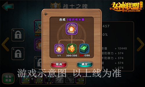 此外,玩家可以用其他材料对初级护佑水晶进行合成为更高级护佑水晶,随着护佑水晶等级的提高,提供给英雄的护佑加成效果也越高。在护佑水晶和女神英雄的联合护佑下,勇士们的战力会获得重大提升,从此所向披靡。