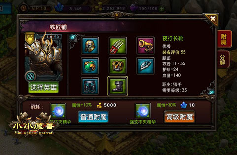 装备类型分为散装与套装,套装拥有额外加成。装备主要通过守护之战与地下城副本产出,同进度时地下城产出的装备品质属性高于守护之战,所以不要浪费体力在守护之战刷装备。在地下城副本入口可查询到该副本掉落哪些装备,装备佩戴分职业,唯有多消耗体力刷本+运气=神装。每件装备科通过消耗附魔材料加金币或钻石大幅提升装备属性,不同品质装备需要不同附魔材料,在刷新装备的同时也是在获得附魔材料一举两得。金币附魔提升10%属性,钻石附魔提升30%属性,50钻石一次很便宜推荐使用!