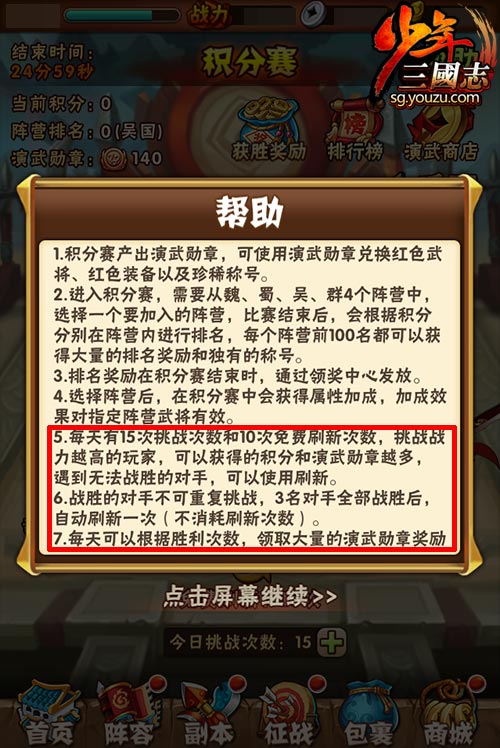 少年每天可购买的参战次数降低了(但是奖励大幅增加),元宝说了不算,实力强才是硬道理!而且此后战争的难度跟获得的奖励是完全成正比的,对手战力越高,一旦战胜获得的奖励就越多,重要的是还不必担新挑战实力对手战败无法获得连胜奖励,“连胜奖励”将由“获胜奖励”代替,战斗再也没有后顾之忧了。