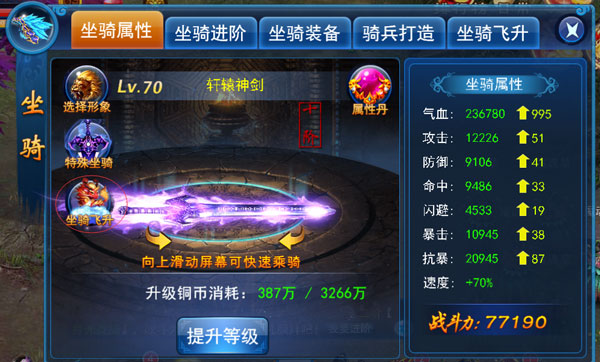 坐骑飞升除了让坐骑有了更炫酷时尚的外形,还能大大地提升人物的实力。不同于坐骑升级小幅度的提升,坐骑飞升可以从本质上大幅提升人物属性,对于人物战斗力的加成也会发生质的变化。