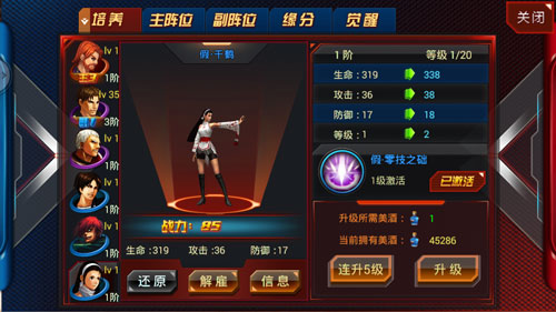 小编的主阵位给的是“最强之虎”罗伯特,坂崎由莉以及拳皇多届BOSS怒加尔,这样选择是因为罗伯特和坂崎由莉有武道男女的缘分加成,而且罗伯特的无影脚能接我技能冷却时的连招空白间隙,坂崎由莉的飞燕烈孔则能使敌人浮空,怒加尔的凯撒帝王波攻击力超强,非常适合远距离先手。每次打BOSS的时候依靠这三个帮手,小生至少能连200式以上,敌人无限倒地毫无还手之力。当然,《功夫格斗》提供了近百位拳皇人物作为帮手选择,要在那么多格斗好手中进行取舍实在是有点难度,但是青菜萝卜各有所好,究竟哪个帮手才最适合自己呢,这还是得在实战中去体会,去甄选呢。