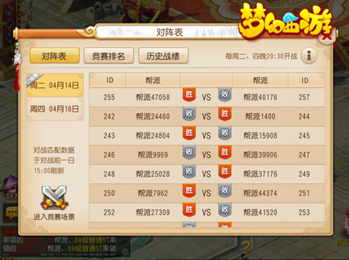 帮派竞赛,顾名思义,必须是要求玩家具备帮派成员的身份才能参赛,每逢周一周三报名,当天15:00前出现明天的对战表格,周二周四21:00——22:00准时开打!玩家们也无需害怕碰到过强或者国弱的对手,因为除了首届帮派竞赛的随机分配之外,之后的每一届大赛都将通过帮派规模和历史战绩两大要素进行匹配,每四周的帮战为一轮计算历史成绩!好了,既然一切明了,那么我们马上就去长安城中的帮派竞赛接引人处开始报名咯!