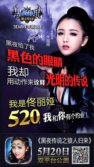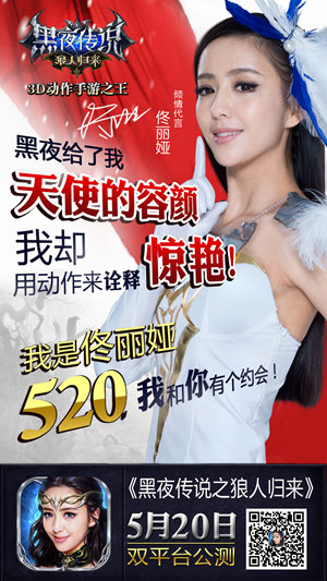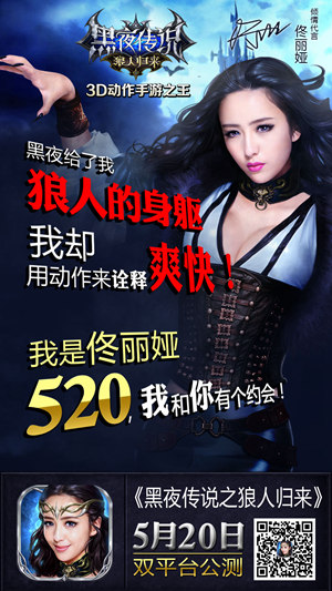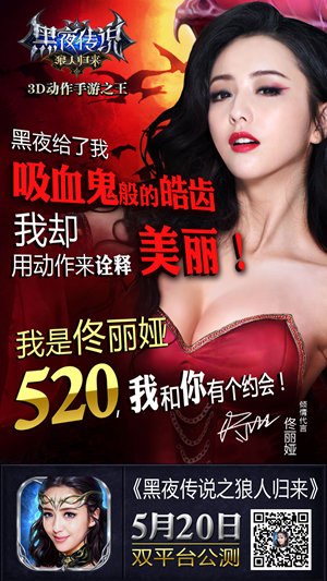 520告白日,和人气明星甜蜜面对面约会,机会难得你来不来?3D动作手游之王《黑夜传说之狼人归来》双平台公测5月20日震撼开启,女明星佟丽娅倾情加盟代言,其公测视觉海报惊艳曝光,玩家不仅能欣赏到由她绝美演绎的多种风格角色,与她真人真声零距离互动狂欢,还有机会畅享澳洲浪漫之旅!