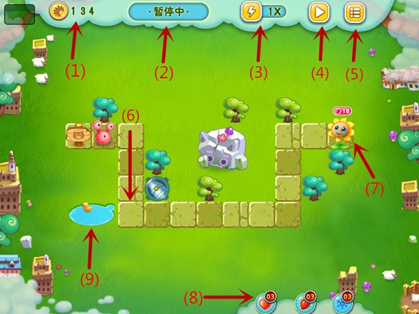 (7)花儿:会显示当前花儿的血量,10点为满值,每当一只怪物到达终点就会损失1点血量。玩家可以通过道具来补给血量。