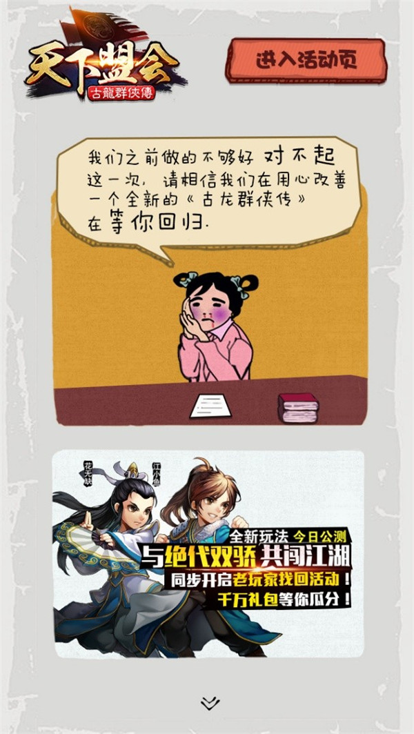 此次最新版本为“天下盟会”,新版本对于游戏的交互性、功能性、玩家可玩性和画面优化与技能丰富做了很大的改进,获得了很多玩家的喜爱和支持!随着新版本更新官方还出了一个趣味满满的H5来表达对玩家的歉意,以“妈妈再打我一次”的图素为主题,告诉玩家可能以前做的不够好,但官方一直在努力,一直致力于为玩家呈现最好的古龙江湖而奋斗,同时开启了老玩家回归奖励Applewatch以及游戏内部奖励等活动,可谓诚意满满,并顺利召回了大批流失的玩家!