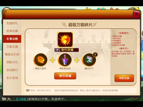 神兵利器再次放送,只需融合石即能合成神器。神器也可再次合成,从荣耀到冰眼再到玄黄,终极属性加成让你上天入地所向披靡。单单荣耀的属性就可以有800万的血量、80万的攻击、2000暴击、1000格挡以及百分比攻击和血量的加成。
