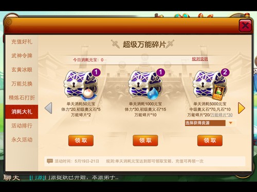 在活动期间内,精炼石将会以打折专场出现,包含9折、7折以及6折场等,根据玩家的充值可进入这些场所之中。场内玩家所消耗的元宝都有可能变成万能碎片。另外,此次活动还有消耗元宝得大礼的活动,也就是充值加上消耗元宝就可以获得双重的奖励。
