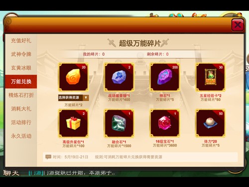 万能碎片无所不能,在此次活动中所获得的万能碎片将可兑换任何高阶道具。根据数量可以兑换奥义石、神石、经验卡、升星包甚至是体力等多种道具。每种兑换都有单天限制购买次数喔,赶紧来一起加入兑换的行列来吧!