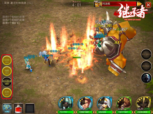 在战斗界面的左侧有四个圆圈按钮,进入战斗时默认为自动战斗,此时的自动战斗仅仅是自动带路自动进行普通攻击。玩家若想自动释放技能,则需要花费50金币;战斗加速需要100金币;自动使用药剂则需要25金币。再次点击按钮则又回到手动状态,玩家可以随时切换操作方式。自动操作适合玩游戏时间不多的上班族学生族,边工作学习还能边升级打怪。