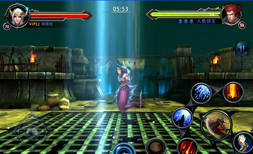 游戏采用经典的虚拟摇杆搭配技能按钮,除了使用摇杆也可以点击屏幕任意位置让人物移动,右下角就是四个技能按钮和一个普通攻击了,玩家可以自由搭配自己最喜欢的四个技能。在锁定目标上,游戏通过攻击键上下拉动进行选取,在混乱的团战面前,新手们可能会有些凌乱,不过,游戏很贴心的采用了自动+手动的操作方式,对于新手来说大大简化了难度,而对于高级玩家来说,当然是手动操作更加好玩啦~