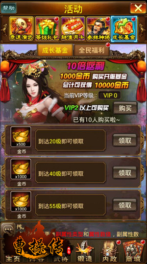 关于成长基金,现在小编可以理解为还是玩家需要亲身用金币去购买,然后获得总额高达10倍的金币返还!虽然,这十倍金币不会是立刻全额返还,而是划分了等级段,不过对于有心于3k玩《曹操传》经营称霸的玩家来说,这10倍金币的返还只是迟早问题。目前,成长基金暂定为新开服的服务器中可以购买,至于旧服当中能否享有同样福利,暂时还不得而知。