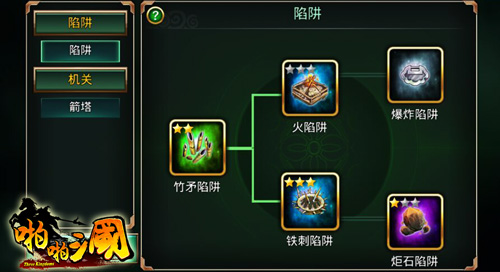 陷阱的成长分为两个类别,一类为火焰类,能造成持续性火烧伤害,总体伤害量较大。二类为物理类,会造成爆发性伤害,伤害量相对小,但是升级至炬石陷阱后,会降低敌方士气!