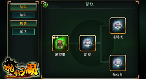 机关的成长线相对简单,目前只有箭塔类,可以对进入攻击范围的敌军进行多次输出。通过升级可以提升箭塔的攻击力以及生命值。