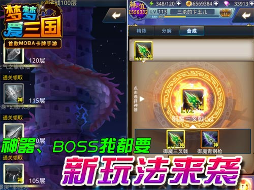 主公征战三国多年,手里有大量品质不错但限于神器位置有限,很是心烦吧?《梦梦爱三国》全新玩法“神器合成”上线,帮主公把这些无用的装备变废为宝,比如御魔青钢枪+三尖两面刀就可以变成的超级神兵,不但保留原装备的技能,而且属性暴增,主公快来试试吧!