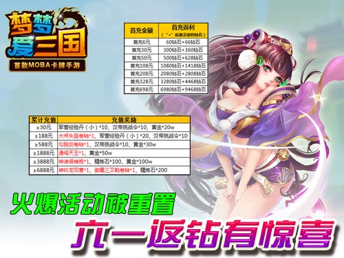 为了回馈各位玩家的支持,《梦梦爱三国》将在全服再次开启充值返利活动,六一活动开始时游戏内的充值返钻石活动将会被重置,所以就算是已经享受过充值返高额钻的小伙伴们,在活动开始之后,再次进行每个档次的首次充值,即可再次享受到充值返高额钻石的福利!