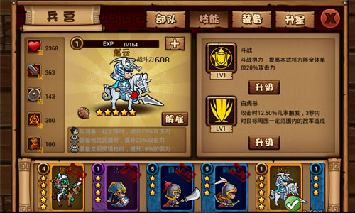 斗战: 斗战得力,提高本武将方阵全体单位一定比例的攻击力。