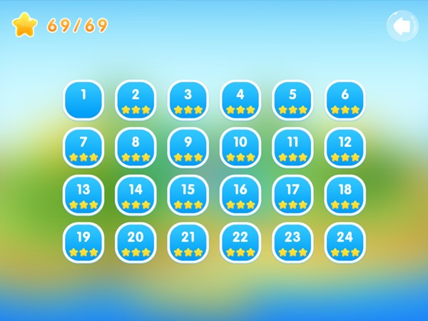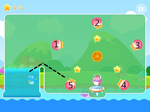 本关设置了5个定向炮,但一般玩家都会被第一个定向炮给吸收,并被传送到4号位的定向炮,然后就会被弹射到终点,但这样的路径就无法收集到三颗星。所以该关卡真正的关键就在于力道的掌握,只需轻轻地将小鱼弹射到第5个定向炮,并注意避开第一个定向炮即可。