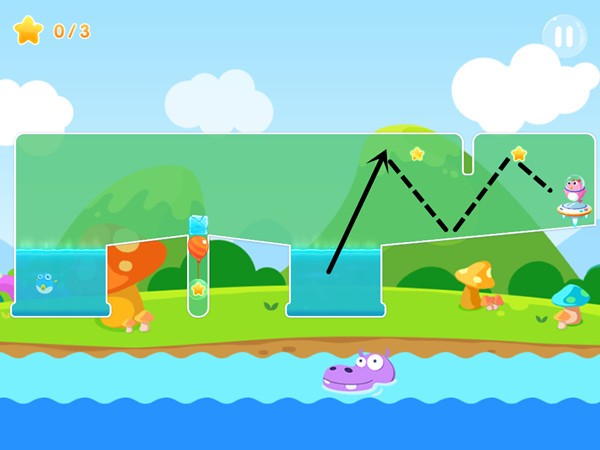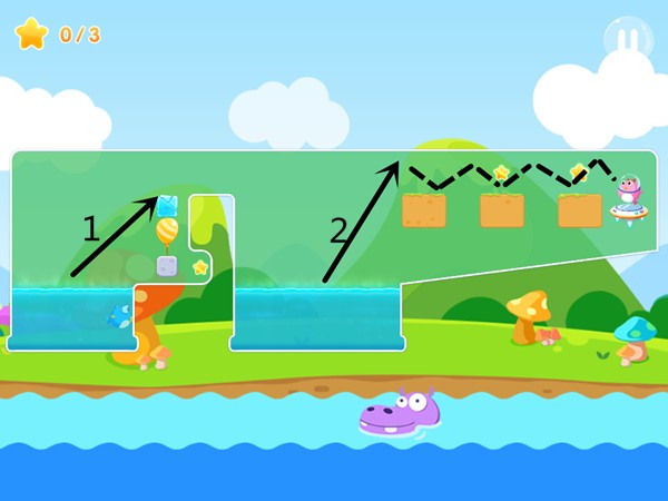 该关卡就需要判断好时机的先后顺序,首先要将冰块击破,且这过程不能碰触气球否则就会让石块一起掉落就无法收集到星星。收集完第一颗星星之后,用小鱼将气球弹破即可来到第二个障碍处。接下来就要利用墙壁和地面的反弹原理,先用力将小鱼弹射到顶部,并控制落点会弹射到第一块地面,之后小鱼就会反弹到第二块地面和第三块地面,并收集到其他两颗星。