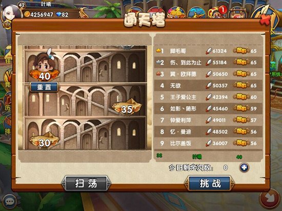 每天有两次免费入塔的机会,进入通天塔后,界面上方会有战斗时间提醒,注意要在规定时间里消灭怪物,否则就算挑战失败咯。一旦失败,则停留在最后通过的楼层里。