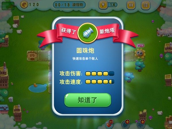 这个关卡只有炮塔,在获得新炮塔时会有详细的介绍,包含攻击伤害和攻击速度。初始小怪的血量并不高,有两三根顶级防御炮塔即可顺利过关,不过鉴于要清除地图的周边障碍,所以建议本关还是要以数量取胜,先将周边的道具障碍清除,再去考虑升级防御塔,以免出现漏网之鱼让怪物逃脱。