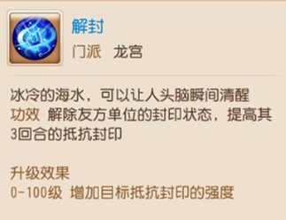 【龙宫——解封:解除友方单位的封印状态,提高其3回合的抵抗封印。】