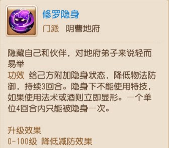 【地府——修罗隐身:给己方附加隐身状态,降低物法防御,持续3回合。隐身下不能使用特技】
