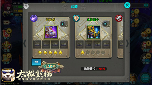 《太极熊猫》战场中战骑必须上阵才能用于战斗,并且只能上阵一个战骑。战骑将会给人物增加额外属性,骑乘类似变身没有CD限制,上阵后会有一套专属的战斗技能和属性。当玩家骑乘状态下被攻击,会扣除战骑自身血量,和人物无关。战骑有普攻、输出技能和天赋技能。并且普攻可回蓝,攻击技和天赋技能将会消耗MP。骑乘状态下,玩家需要切换一套独有的战斗模式进行操作,享受法术暴屏、纵横敌群带来的畅快体验吧!