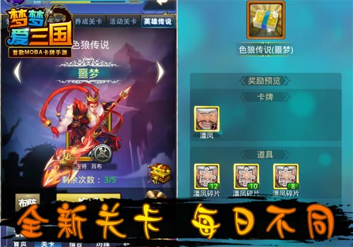 三国的英雄都有自己的国家,他们为国家出生入死,才有了纷争的三国。现在,《梦梦爱三国》开放新玩法“英雄传说”,每天开启不同的关卡,只能使用特定国家的武将挑战,每天能挑战五次,挑战中会有相应国家的大将助战,挑战成功会掉落名将碎片。此外,每个关卡都有五种难度,难度越大掉落越好。