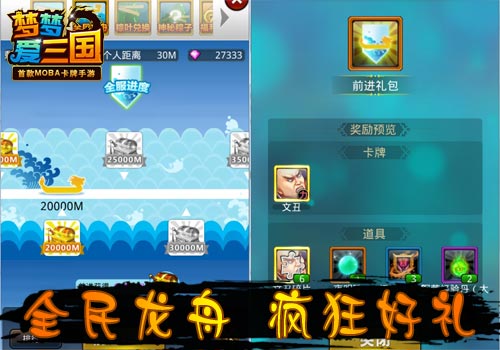 迎新版,庆佳节!《梦梦爱三国》端午节特别活动全民龙舟开启!在端午节期间,每天的8:00到22:00之间,玩家可以通过各种形式推动龙舟的进度,每推动一次就有一次活动奖励,当龙舟的进度达到特定距离时,全服玩家都能领取“前进礼包”,同时还有龙舟进度的个人排行榜,对于贡献最大的个人还有专属大奖呢!各种金卡碎片,游戏道具、金币等你来拿哦!