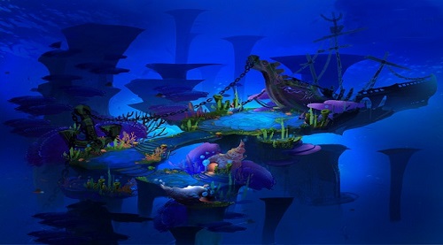 这里就是《莽荒纪2》游戏中的海底场景,可以看到从远方的乱石,到近景的沉船、铁锁;刻画地都非常精细,甚至连一些细节的海草以及地面纹路都有详细描绘。这样在游戏时才可以真正将玩家代入其中,和主角一起领略《莽荒纪2》中的激情和热血。