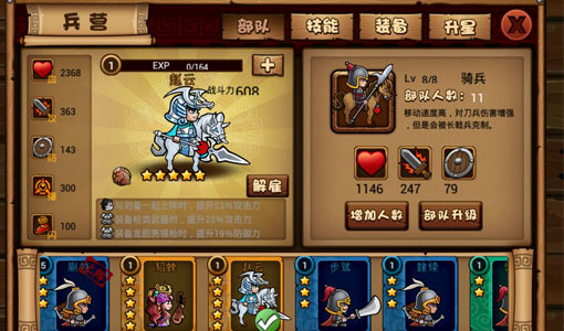 除了以上两个攻击技能外,“疑兵”这个控制技能合理运用瞬间吸引敌军强制攻击,可为后方输出兵种提供大量的时间,使得输出更加给力。还有“投石车”这一另类的技能,可以召唤一辆投石车,给地方造成大量的范围伤害。这样一来,战局出现大逆转,己方占据强大的优势,也争取到了更多进攻的时间。