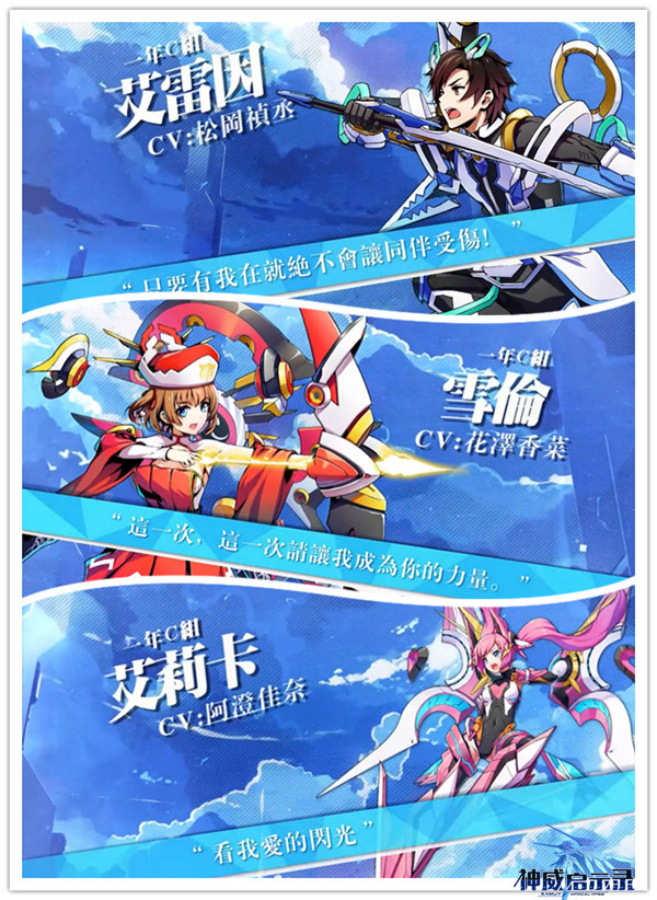 在已公布角色中,热血暖男艾雷因,温柔软妹雪伦,元气少女艾莉卡,他们三人的飞行铠最先曝光。此外游戏声优阵容也是空前强大,邀请到后宫王松冈祯丞、软妹系花泽香菜等人气声优为游戏角色助阵。