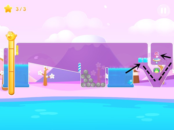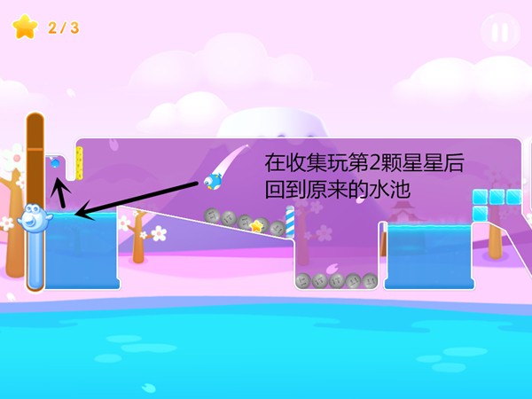 接下来就是下半部分,也是本关会致命的阻碍——河豚。首先我们需要操作小鱼击破入口的冰块,轻轻碰触即可,用力会导致反弹。在看准时机等河豚要向上巡逻时操作小鱼进入,并适时地进行加速冲刺,以便让小鱼能够冲向目的地。