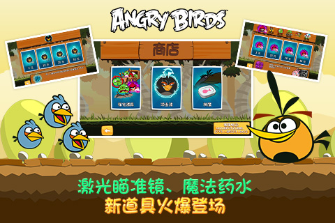 新关卡闪亮登场,小鸟和绿猪的战斗全面升级,游戏道具也必须给力!鸟震猪摇震动升级,天崩地裂一般的震动看绿猪无处可逃;激光瞄准镜准确度猛增,让你从此百发百中。还有增加了“香料”的魔法药水,让小鸟精彩变身。