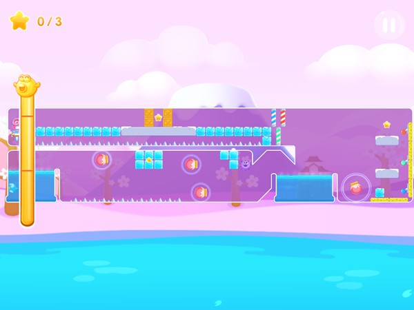最后一步就要进入冰上的区域,大家都知道小鱼每一次的弹跳碰触都会让冰块融化,而且一旦加速就会让冰块破裂而直接掉入尖刺之中。所以在冰块区域不要使用加速,到接近木箱时再使用加速冲破的技能,但切记不可浪费太多能量,以免无法达成金鱼的成就。
