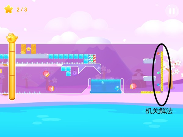 在第二个水池时,首先先来看下左上方3根机关门的布局,很明显只要打开蓝色和红色的按钮就可以将这两个机关门打开。但碰到红色的按钮必定会让小鱼直接下降而导致粉红色的机关门向上关闭。不过,这也是过关的一个过程,即使粉红色的机关门上升,我们只需再去碰触一下即可再次打开。但很多玩家可能会在这里浪费不少时间,因为碰触到粉红按钮时,又会下降导致蓝色的机关门又再次被关闭。所以在碰触第二个机关前就要马上使用小鱼加速的技能,借助反弹力的效果小鱼就不会下降下去。