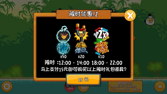 而且小编注意到,在《愤怒的小鸟之守蛋计划》当中,冲击波加入了限时礼包套餐。也就是说,玩家在每天12点到14点、18点到22点两个时段登陆游戏,就能以折扣价格购买冲击波、能量弹弓和双倍积分在内的道具,玩家朋友们可以试试看。
