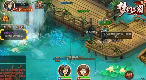《梦幻三国》中武将合理搭配后,会生成不同的缘分组合,从而增加角色的战斗力,只要再完成大家耳熟能详的是关云长过五关斩六将任务,就可以开启全新的“过关斩将”玩法,让你也知道常山赵子龙当年是怎么七进七出长坂坡。或者没事了就去玩一把捕鱼达人,这钓上来的可都是钱,最差的都有几千金币,更别说最好的鱼儿还能换取钻石呢,钓鱼享乐,乐哉乐哉~还有更多妙趣横生的玩法等待你来挖掘,快来疯狂一夏吧!