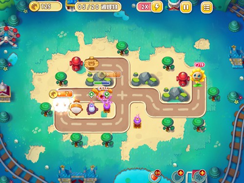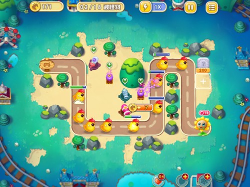 过关策略:本关的防御塔有些特别,防御塔会以问号盒子的形式展示,玩家建造之后就会随机产出一根防御塔,也就是在这局游戏中是不能由玩家来选择要建造何种防御塔。所以本关游戏还需要考验玩家的运气成分。前期同样在中间的地带建造盒子,不论出现何种防御塔都可以将小怪清除,在空闲时间再将周边的障碍物清除,特别是两颗蛋状的山,能在前期直接清除就可以占据很好的优势。
