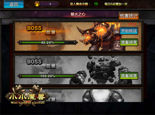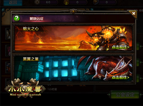 《小小魔兽》燃烧远征副本每周更新一次,每个副本可以挑战四次。独具特色的多人挑战系统,支持多个玩家同时挑战,燃烧远征中的Boss统计,让玩家的战斗体验更加丰富。不同以往的是,挑战BOSS的奖励不仅丰富而且更具人性化,通过对副本BOSS的伤害统计可以获得相应的DKP,BOSS击杀后以竞拍的方式获得奖励,能者多得哦!