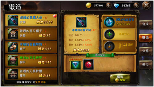 传统RPG游戏中,玩家每次更新装备后都恨不得把原本装备的强化、镶嵌等等都原原本本的给扣下来。《罪恶之城》中,玩家不必再有如此的烦恼了,装备的强化与镶嵌会自动转移到最新的装备上。强化装备的过程也不再充满传统RPG游戏坑爹的随机性。装备的强化与镶嵌真正的实现了一举成功、一劳永逸。让玩家可以随心所欲的更换装备,不再烦忧。