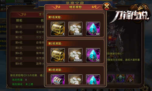 对于在讨伐恶魔战斗中表现活跃战功显著的勇士们,《刀锋传说》还设置了排行榜来表彰各位英雄的不朽战绩,这不单是荣誉的象征,甚至可得到女神额外的嘉奖。每天进入排行的玩家,将会获得大量的银币、洗练石奖励,而排名前三的玩家,更能获得顶级橙色装备碎片。当然除了“恶魔宝藏”之外,还有“英雄试练”、“奇兵夺宝”、“幻境挑战”、“野外矿场”等诸多独创趣味玩法等你大显身手,一展风采!