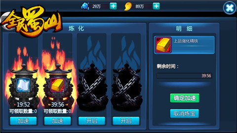 不刷装备开始刷材料了?不不不!《全民蜀山OL》还开放了材料炼化系统,玩家能将低等级材料放入炼化炉中,一段时间后,玩家即可获得高级材料。炼化炉除了能炼化装备所需的材料,也能炼制丹药,当你离过关仅一步之遥时,丹药能在短时间提升你的主角能力,助你更快通过蜀山挑战。