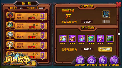 竞技场每天有3次挑战机会,每天18:00重置。挑战界面会根据你当前的等级战力等列出5个大致同一水平的玩家供你选择挑战,如果没有中意的让你翻牌子,就可以换一批。同时你也可以在挑战界面看到自己的防守阵容,如果发现不给力,就随时调整更换你的驻防军团,解锁新姿势迎击敌人。