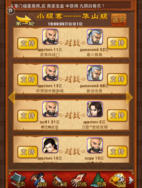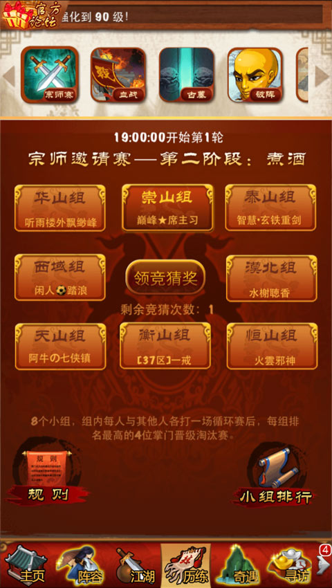 中国第一武侠手游《大掌门》最强宗师赛论剑阶段鸣金收兵,经过三天激烈的对战,128名掌门突出重围,成功晋级小组赛!12日晚,三十二强争夺即将开始,让我们一起拭目以待。