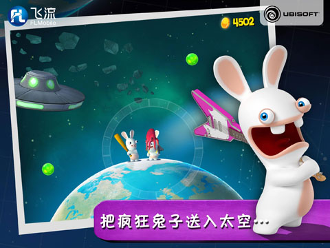 育碧旗下的经典角色“疯狂兔子”即将于8月20日与安卓手机的玩家们见面了!作为疯狂兔子系列的首款手机游戏--《疯狂兔子 大爆炸》不仅继承了原作搞怪的精髓,更加入了宇宙冒险的科幻背景,让你通过简单的操作和疯兔们一起在外太空探秘。《疯狂兔子大爆炸》不单单是一款简单的休闲手游,其充分引入物理学中最常见的引力概念,带来了独特而又新奇的游戏体验,令不少玩家都爱不释手。飞流(FLMobile)作为全球移动游戏发行与运营服务商,在8月20日为国内玩家们献上《疯狂兔子大爆炸》安卓版,还记得疯兔经典的搞怪叫声么--哇~~啊!!!