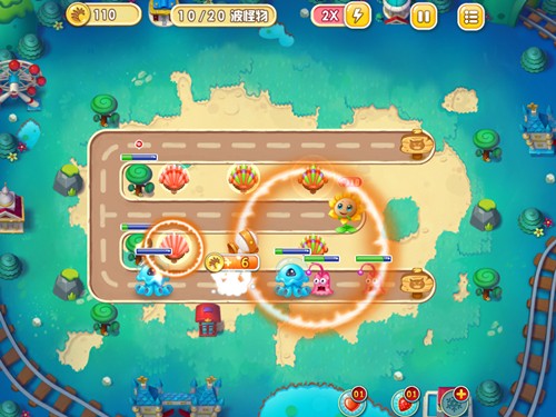 过关策略:正如上面基本配置所述,前期将所有的初始金币用于建造并升级火焰贝壳塔,基本上前面的几波即可将中间区域的障碍物全部清除。之后即可多摆放火焰贝壳塔于中间地带并进行升级,记住本关的关键还是在于升级火焰贝壳塔,数量不是关键,满级才能同时打击到上下两处的怪物。所以,在本关中间的区域布满火焰贝壳塔就可以顺利地通过此关。